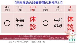 年末は12月31日まで、年明けは1月2日から診療しております![]()