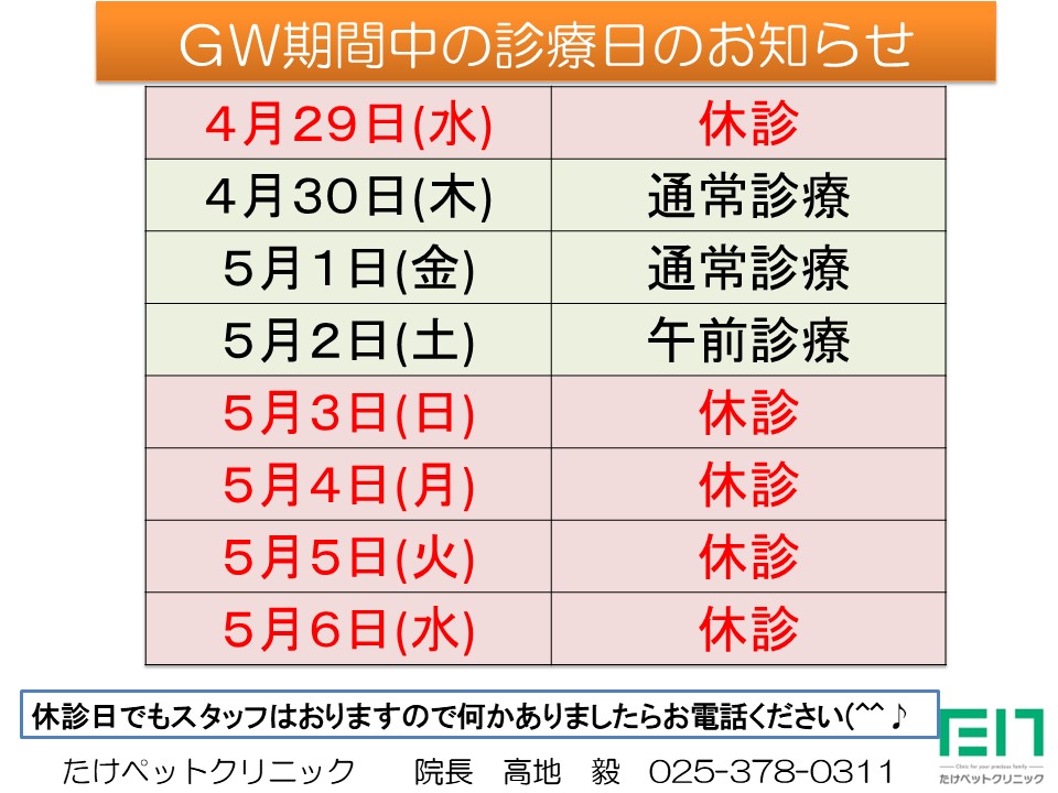 ゴールデンウィーク期間中の診察日をお知らせいたします![]()